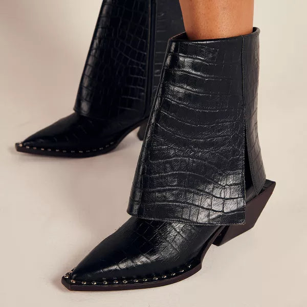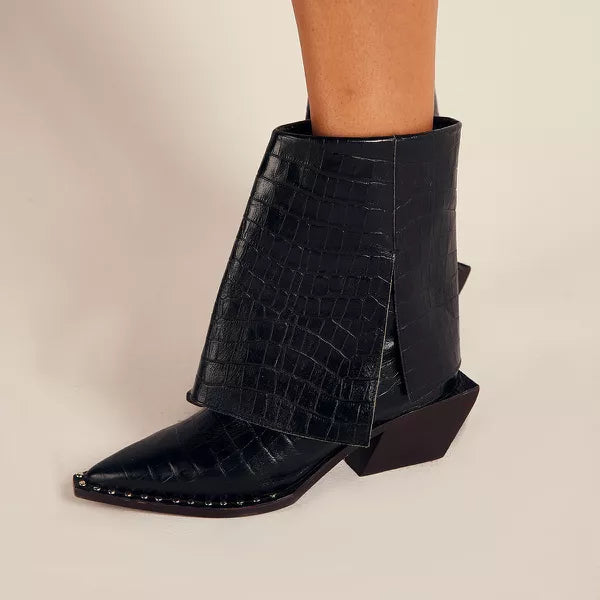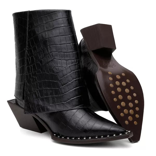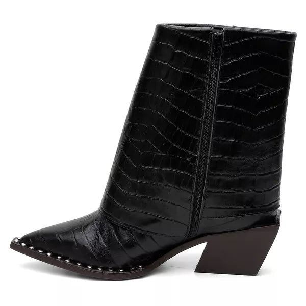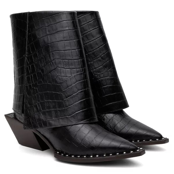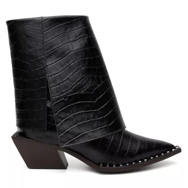 Descrição: Bota altura média produzida em couro crôco, com pala sobreposta e detalhe de costura manual. Forrada com napa vestuário e palmilha confort gricci. Vista sobre a sola no mesmo couro crôco com aplicações de metais. Salto geométrico exclusivo gricci em madeira de reflorestamento super confortável. Sola de couro com sistema antiderrapante de borracha personalizada gricci.