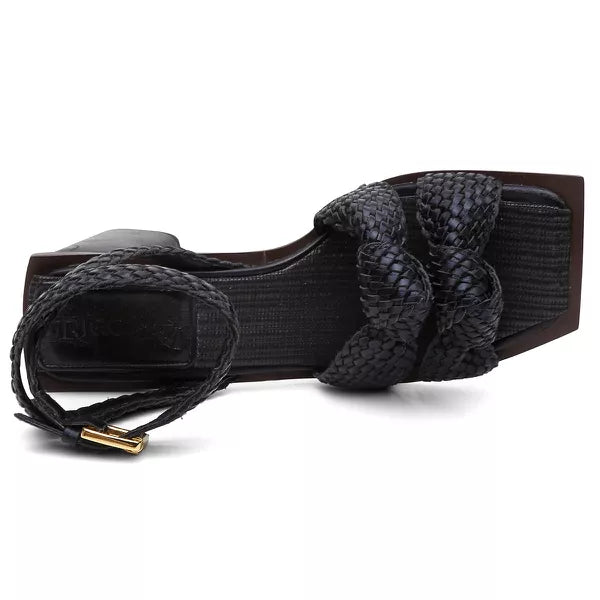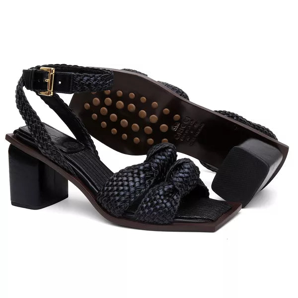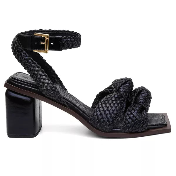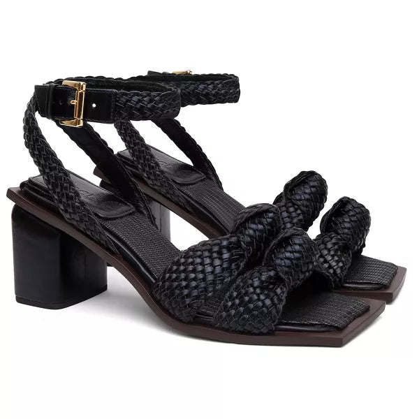 A sandália alta com duplo nó em tressê irradia glamour, destacando-se pelo design laço duplo que confere um toque de moda ímpar, resultando em um visual elegante e contemporâneo.