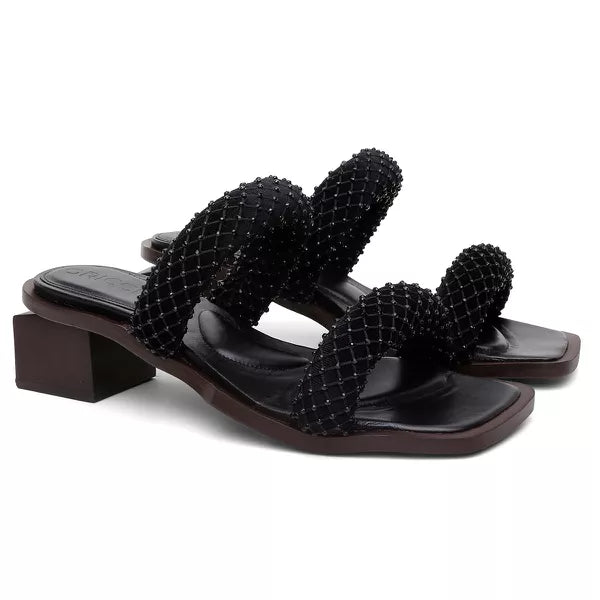 Descrição: Sandália média veludo dois produzida em couro natural e veludo. O modelo de salto médio de madeira de reflorestamento, palmilha anatômica confort exclusiva e solado com insertos antiderrapantes e bico quadrado. Traz duas tiras puffer em veludo produzidas manualmente com detalhes em brilho.