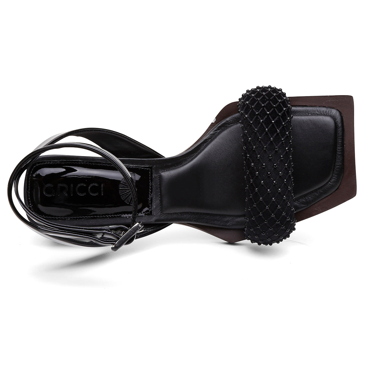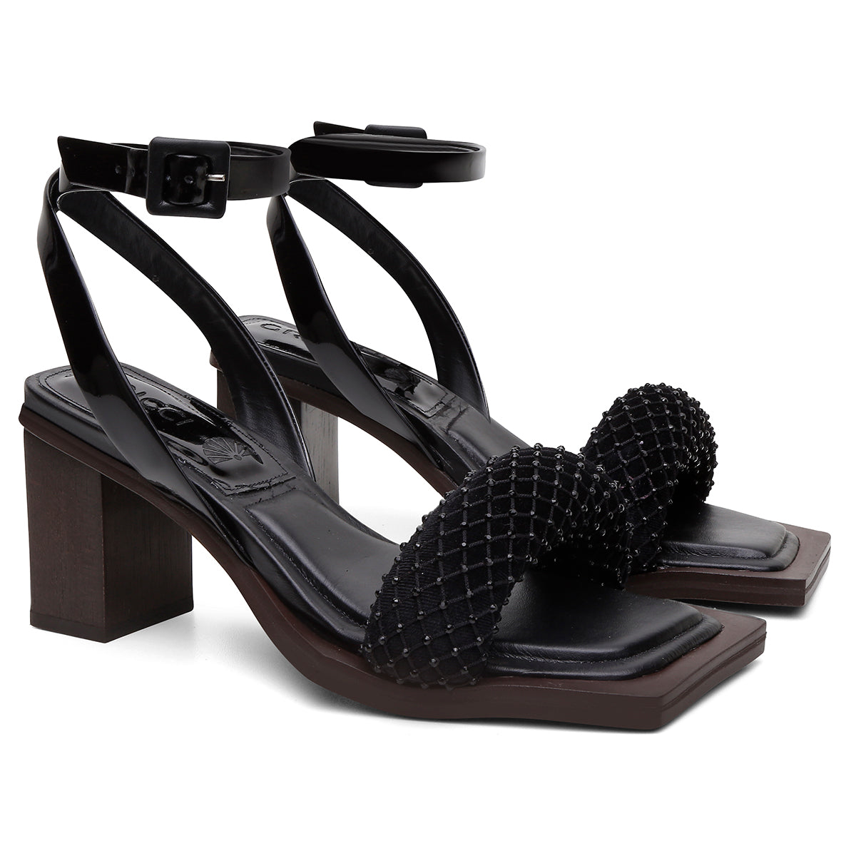 Descrição:  Sandália alta veludo uno produzida em couro natural com veludo trabalhado a mão em fio com brilho. O modelo de salto alto de madeira,  palmilha em couro confort gricci, solado com insertos antiderrapantes e bico quadrado. Traz uma tira sobre os dedos com acabamento em veludo e tira fina de amarração no tornozelo.